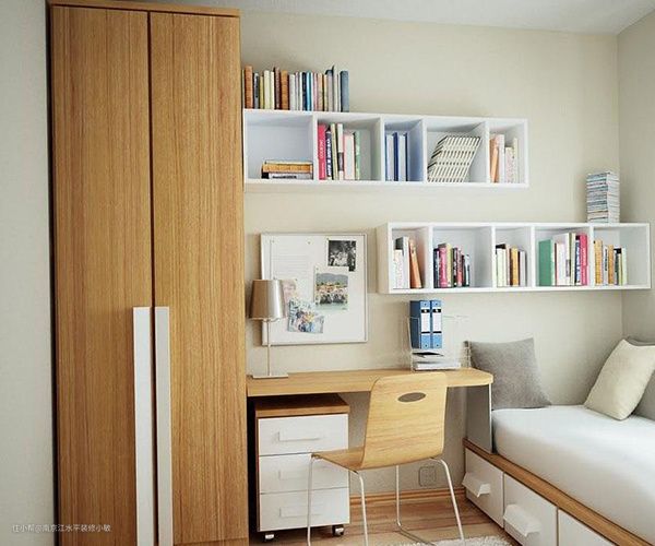 对小户型来说,利用空间的最好方法就是一种空间有多种用途。在装修客厅的时,也可以利用架子、陈设或壁龛的设计,将书房的作用融入客厅之中,使客厅和书房融为一体。它既解决了书籍的摆放问题,又能提供学习工作的氛围。例如,可以把整面墙做成壁架,这种嵌入式书架风格,既不突兀又能合理利用空间,收纳书籍。