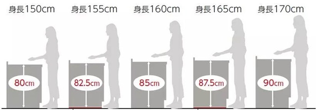 科学反复试验得出,厨房操作台的高度建议与主人的身高匹配(如下图),这个高度正好主人手臂自然抬起的高度,量身定制的橱柜高度让人做饭更省力。