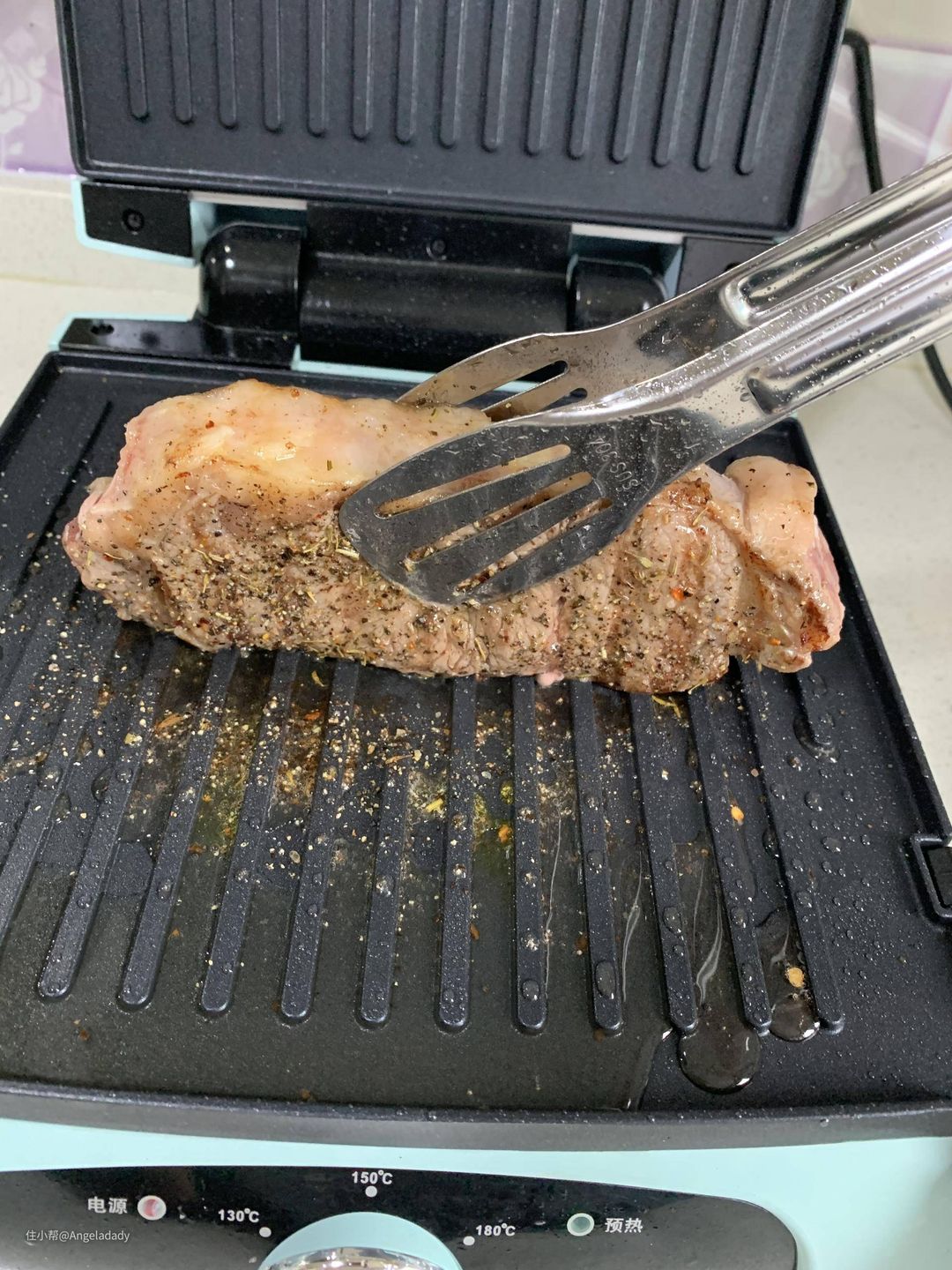 ▲拿出我们的无言牛排机,煎牛排,只需要一面即可,当然通电后,另一面也是烫的,大家操作的时候注意别碰到,以免烫伤。
