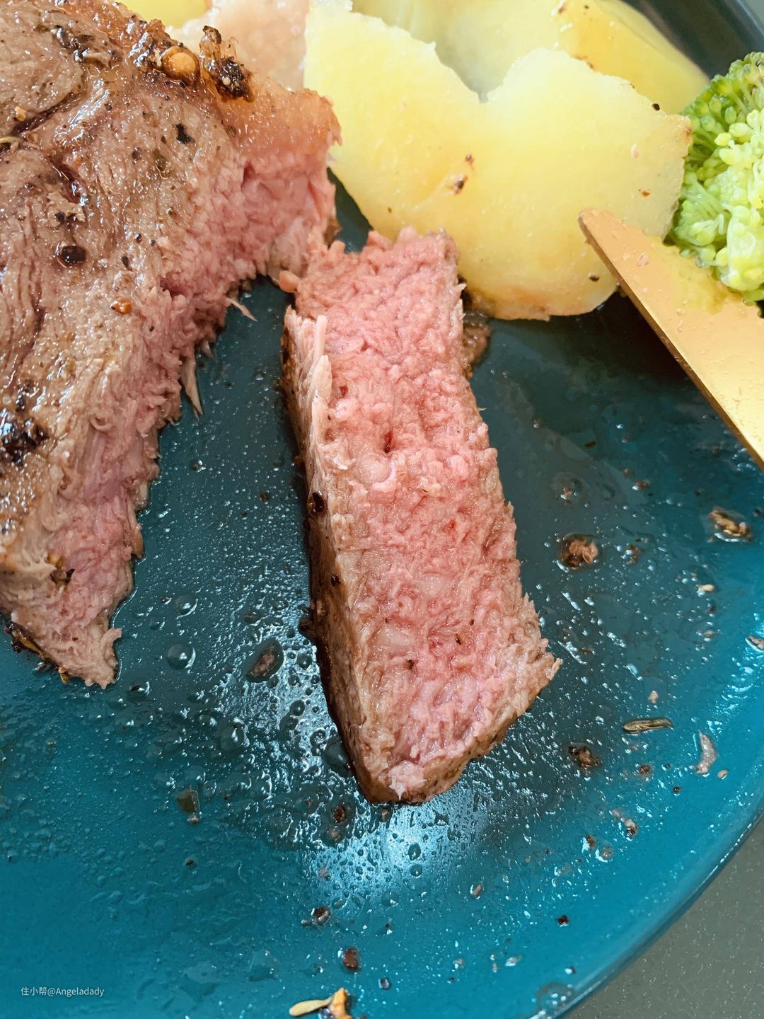 ▲厚切5cm左右的,基本上煎2分半钟就可以了,基本能达到6、7分熟了,喜欢熟一点的可以多加半分钟分钟。
