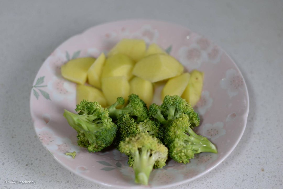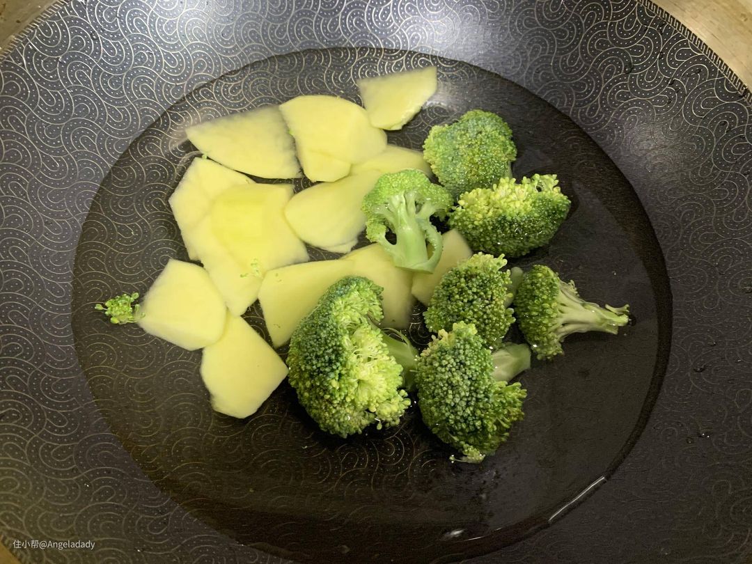 ▲开煎之前,我们可以直接先做配菜,我选了西蓝花和土豆,颜色好看,味道也是小朋友都喜欢的。