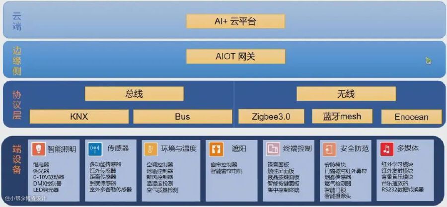 金茂的智能家居系统是通过云端、边缘侧、协议层、末端设备4个维度,把家中各种用电设备进行集中控制管理,并且横向打通协议层和末端设备层,让不同协议类型的设备可以在同一个系统环境中通讯和工作,具有很强的兼容性和整合力。