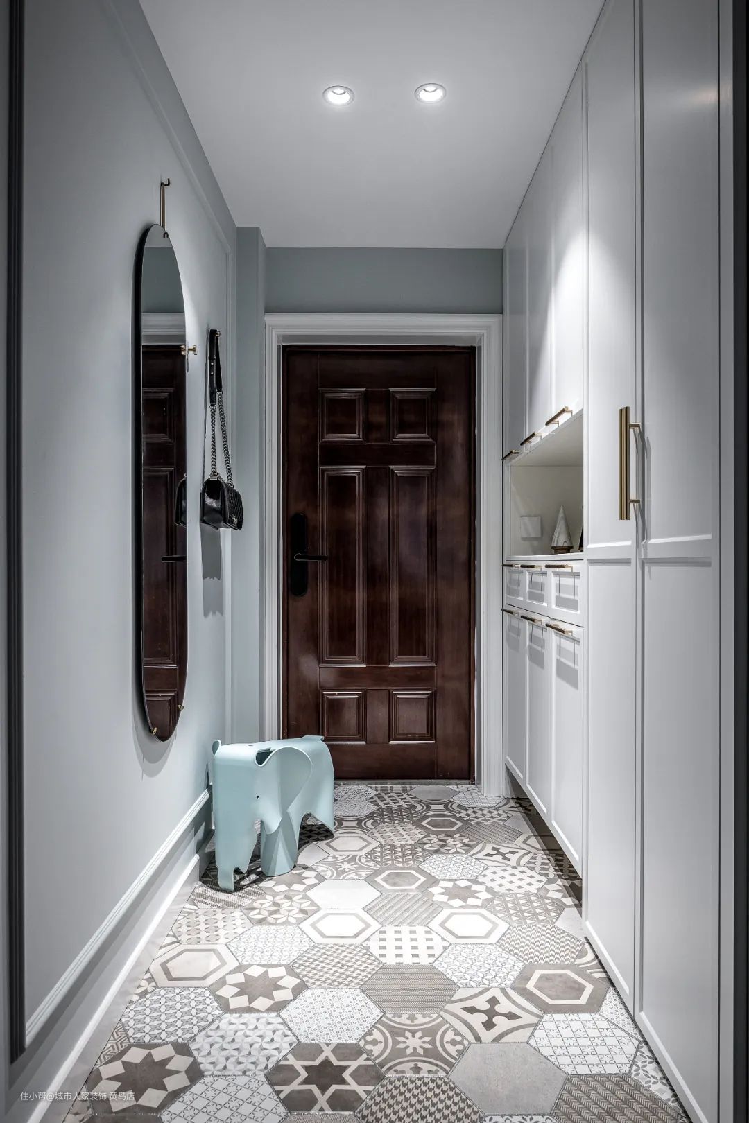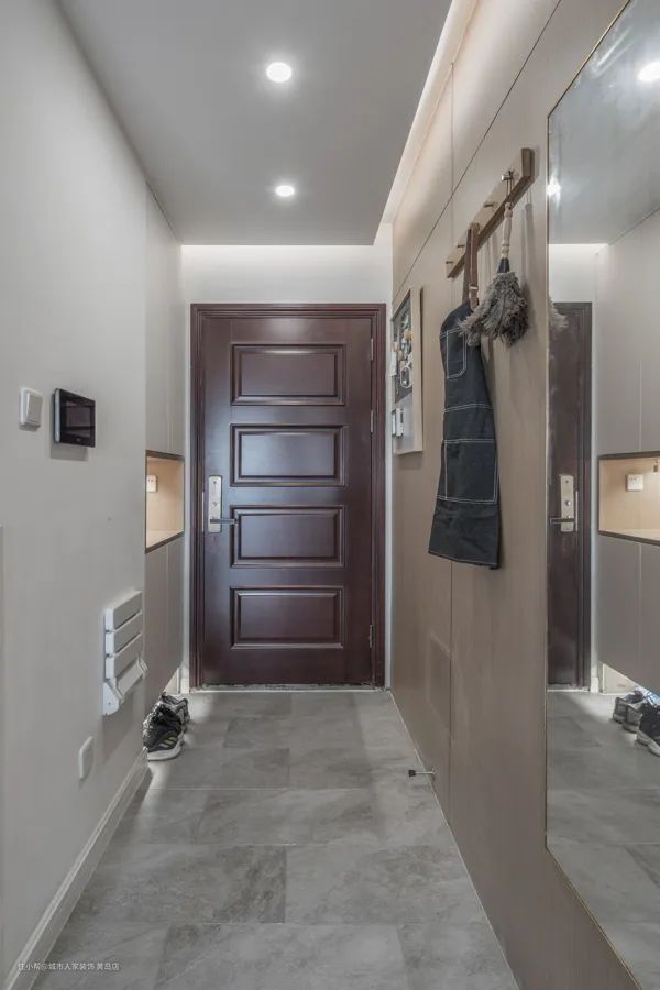 在长玄关的一侧墙面装一面全身镜,这样既能提供方便的镜子功能,又能让狭窄的玄关视觉得到一定的放大。