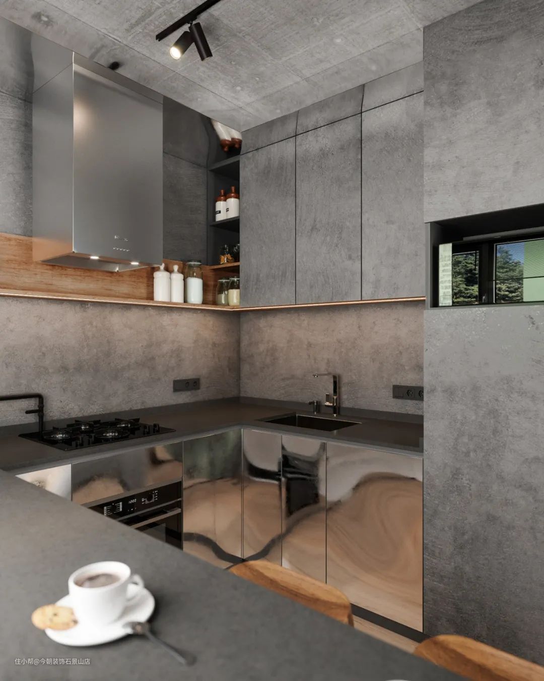 厨房同样是以水泥灰为主,搭配原木地板,摆上餐厨用品,不会觉得压抑、暗沉。靠窗的一侧,设计一个休闲吧台,得优雅高档而又大方。