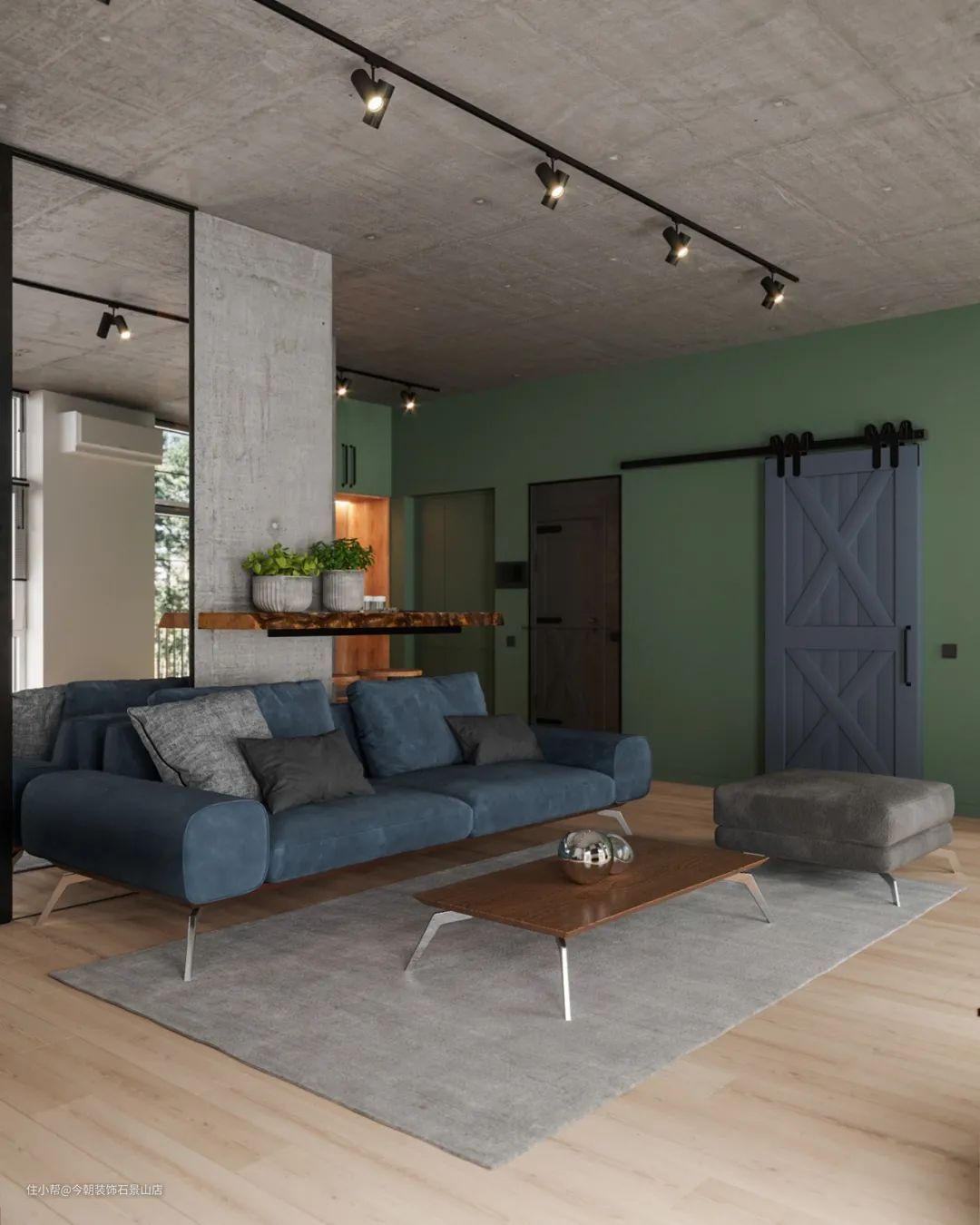 客厅裸露的水泥灰天花和墙壁,搭配原木的地板,绿色蓝色点缀,展现着一份令人心痒难耐的优雅诱惑力。