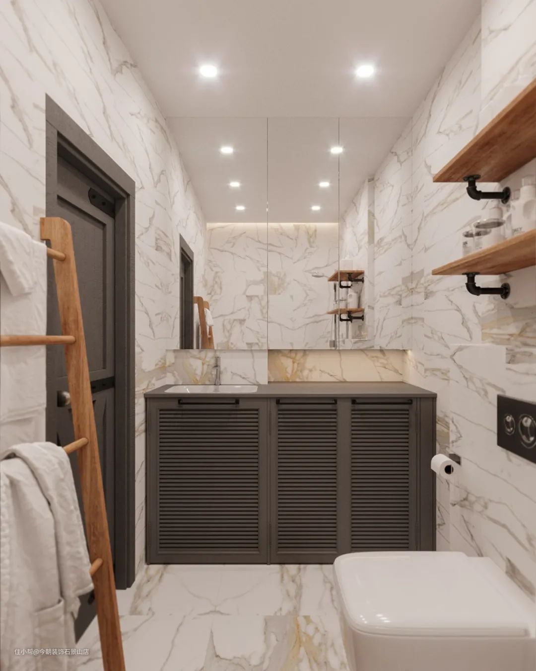 卫生间没有用到水泥灰,白色大理石磁砖,木色的收纳柜和架子,呈现出一个时尚且具有复古的效果。