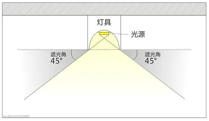 所以,判断一个灯具设计好坏的标准之一,就是遮光角要在45°或以上。