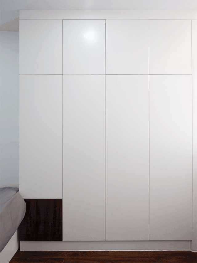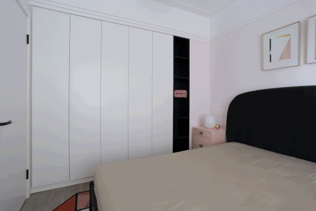 像上图这样,床头柜旁边的这个衣柜门,如果是平开门的话,就会被顶住,开门就需要挪开床头柜才行了。因此从空间利用角度来说,平开门的不如推拉门的衣柜好。