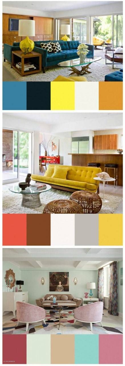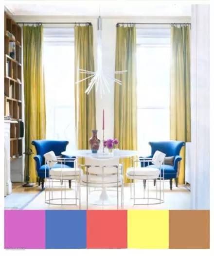 多种颜色的搭配下一定要选好主色调,然后大面积的使用,就不会显得房间凌乱,例如上图的蓝色、黄色、粉色的沙发一样。