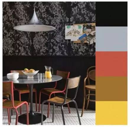 2.咖啡色配米色、鹅黄、砖红、蓝绿色、黑色。