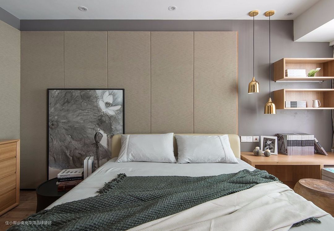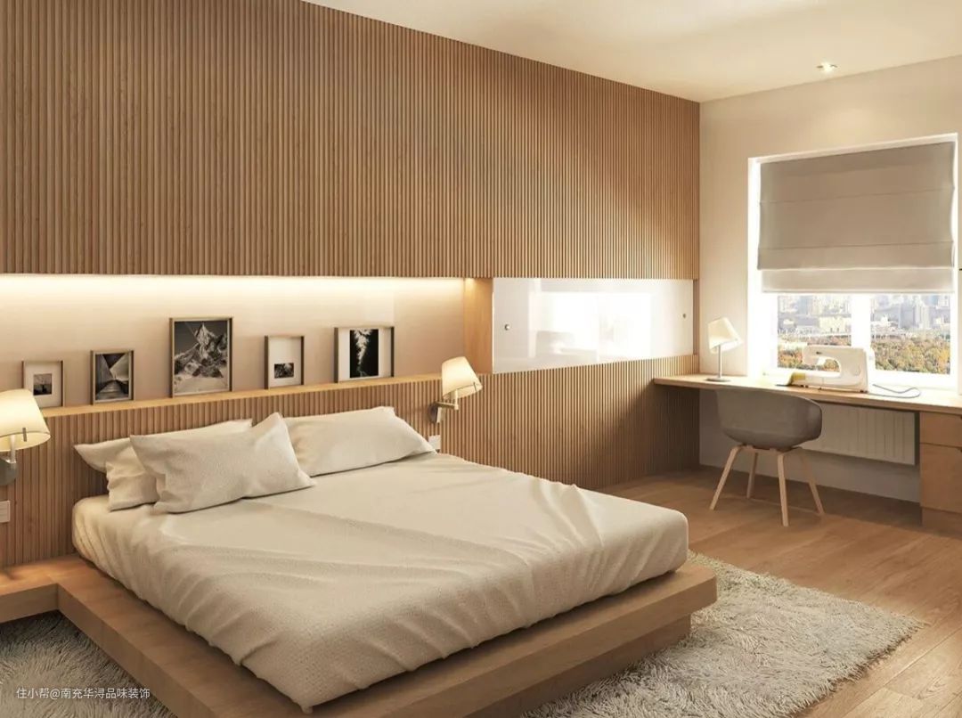 🔺为避免一整面墙都是木材而显得单调,在墙面中部,床头略上位置留白,形成一个简单的台面,造型美观的同时还能摆放饰品。