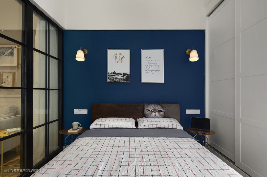 🔺深蓝的色彩,搭配两幅简单的装饰画,一左一右的床头灯,整个墙面简洁干净。除了视觉效果上美的享受外,这样的深蓝色彩还特别有益于助眠,宛如面对浩瀚的蔚蓝星空入睡。