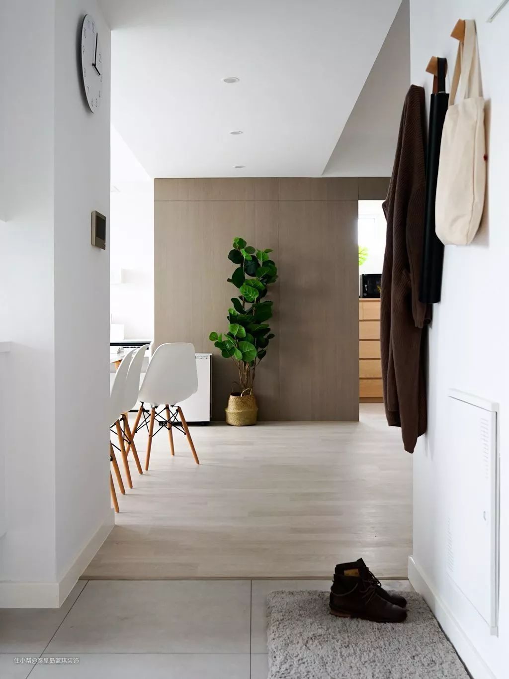 ▲简约的小玄关,散发出文艺的小情调。尽头处的原木背景墙和绿植搭配得甚是应景。厨房