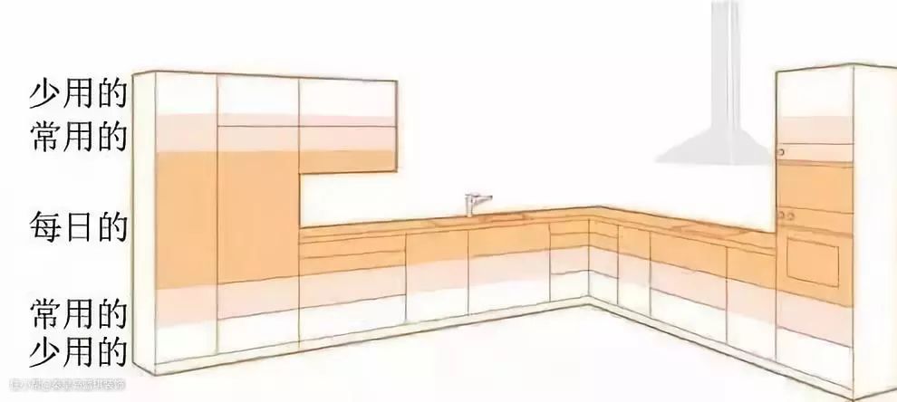 按使用频率分配按照日常的使用频率,将每次下厨都要用的物品放在方便人拿取的告诉,并以这个高度为分界线,上下递减布局常用物品和少用物品。