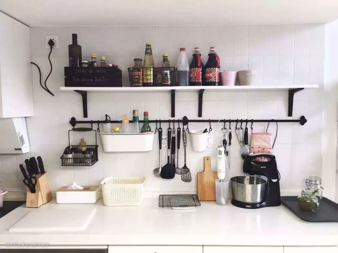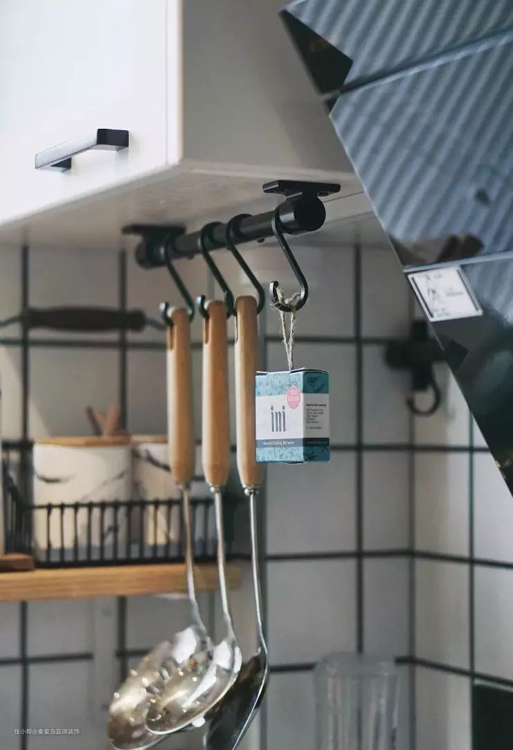 厨房厨具太多堆在操作台上面,不仅占地方还不好收拾。一根挂杆或者挂篮就把它们都挂上墙,整齐好看还方便拿取。