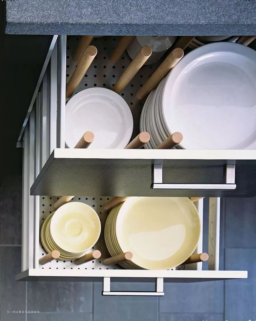 收纳里面有收纳,将抽屉或者橱柜里面也进行储物的细分,将盘子等用具分区摆放,不会遗漏,方便所有人拿取,即使是不经常进厨房的人。