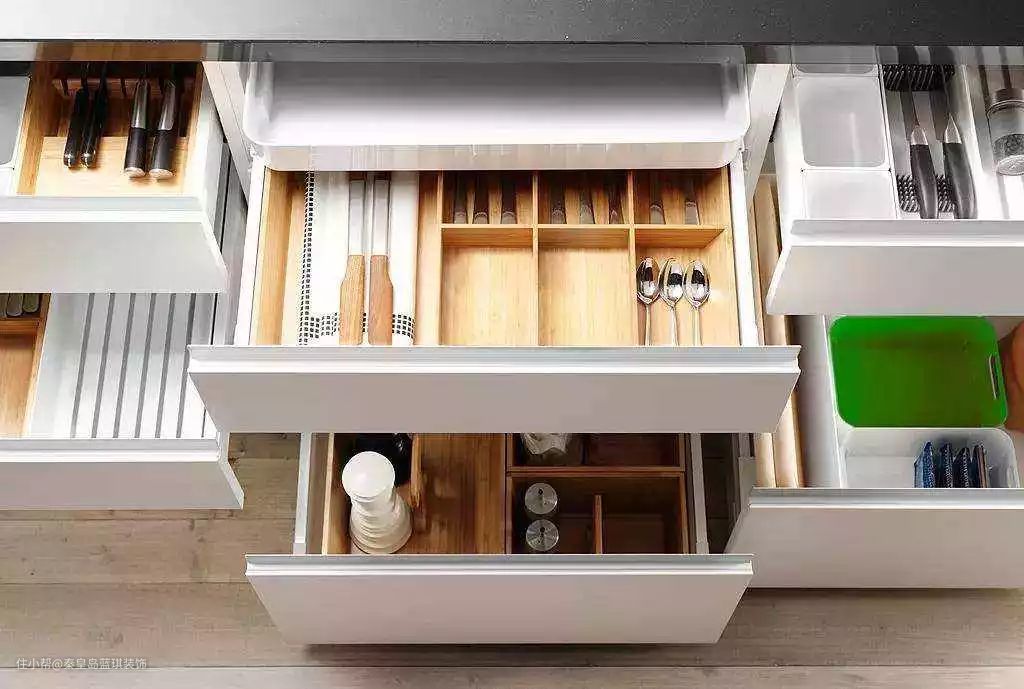 做到收纳中有收纳,常见的如在橱柜或者抽屉中设置分区或者单元格,提升内部的秩序,整齐摆放餐具/厨具。