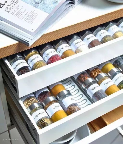 将厨房的同一类物品收纳在一起,不仅看着舒适美感,也能集中寻找不容易遗漏。
