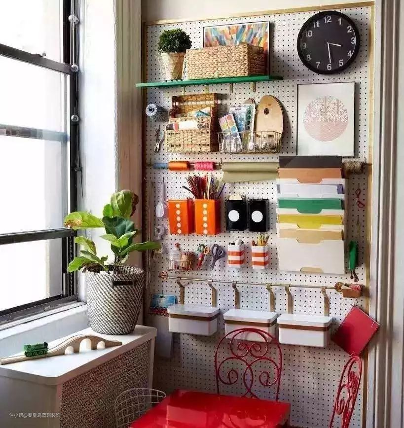 洞洞板有各种尺寸,适合很多不方便安装橱柜的墙角或者转角空间;且能与木棍搭配多中种收纳格局,收纳物品类型也可多样。