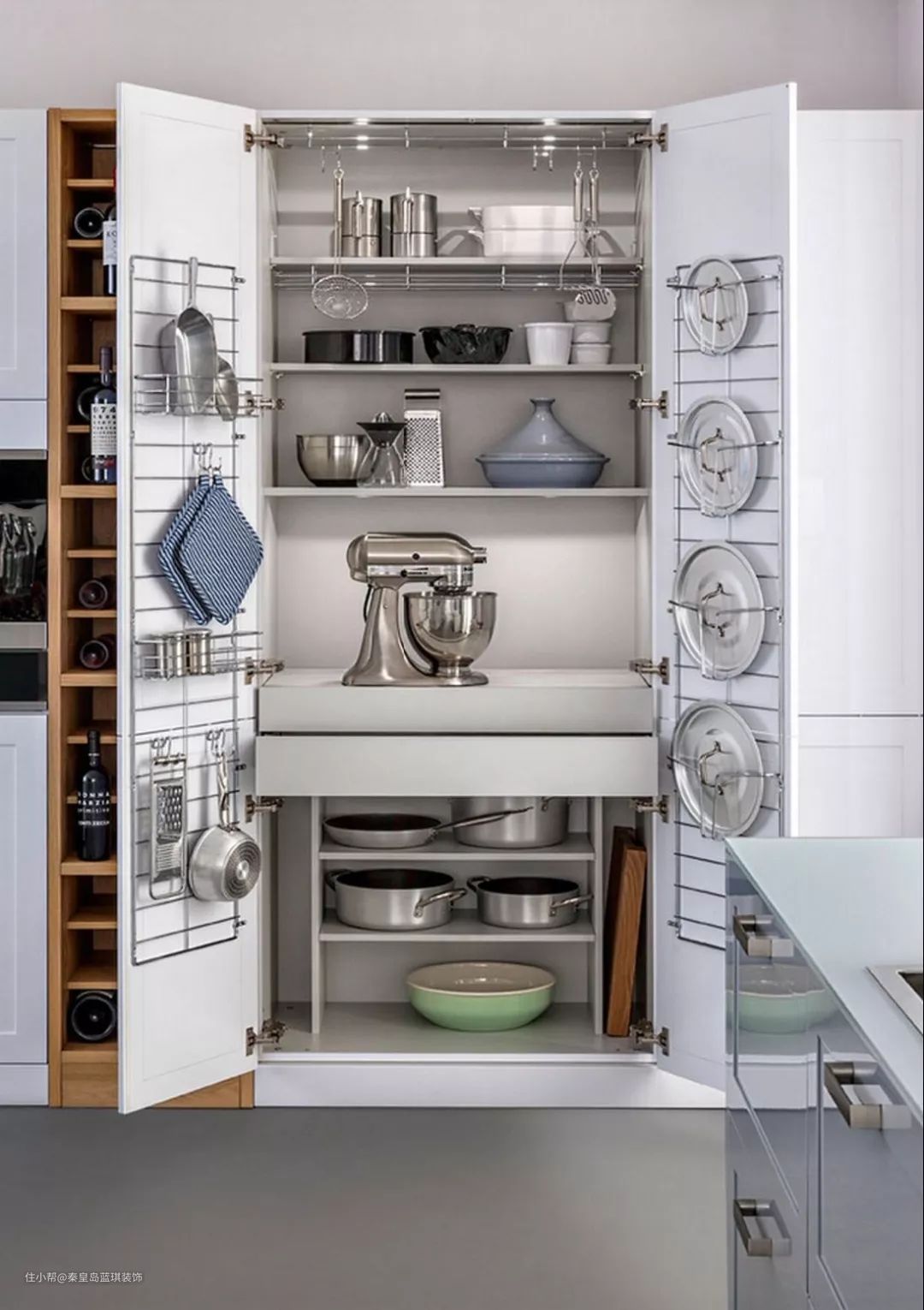 隔板架常装在备料区的上方,杯盘碗碟和调味料都能放,但是需要经常打扫,中国式厨房不建议大面积使用这种设计。