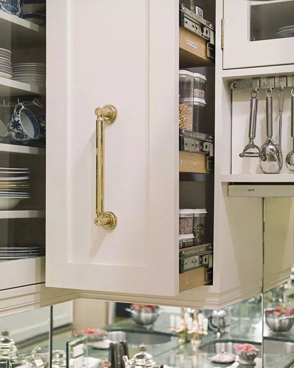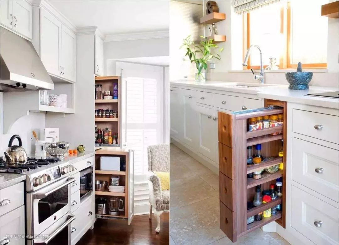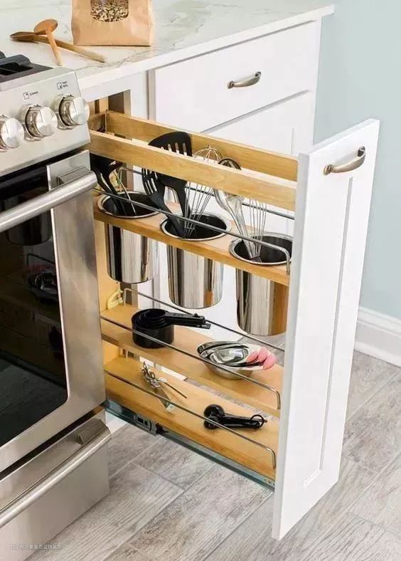 一些角落不好利用的空间都以这种“见缝插针”的方式设计一个合适的拉篮柜,便捷度高,容量大,能为日常的烹饪带来更多的便捷。