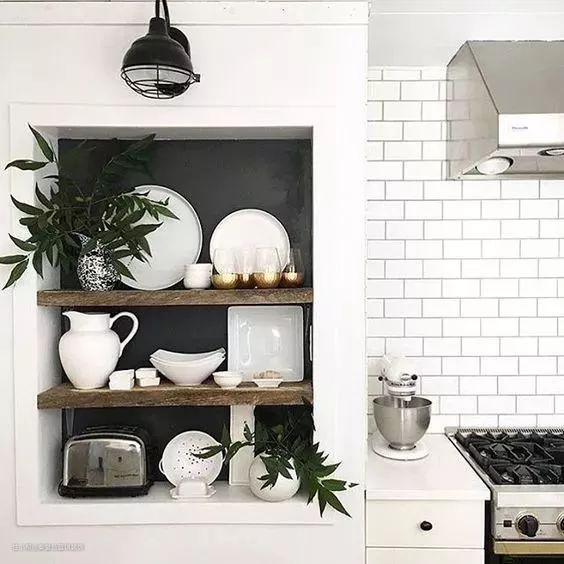 在厨房墙面上设计壁龛收纳,不仅节约收纳空间,也可以很好的与整个背景相融合,视觉效果可以更加整洁。