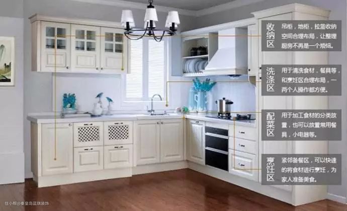 布局合理的厨房一般会有洗菜区、备料区、烹饪区三个功能区,不同功能区都会有自己常用的物品,我们按功能区就近分配即可。