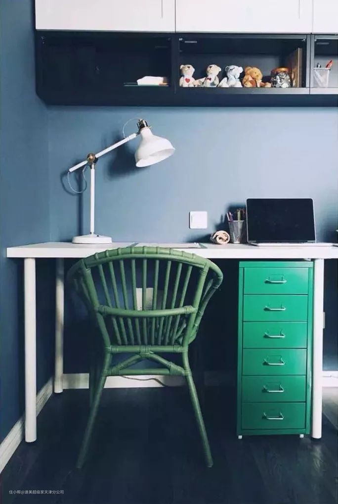 若是书桌下的空间足够,在书桌下的侧边增加一个抽屉柜,这样既让书桌有了收纳储物空间,又不会影响坐下时候的放脚,是比较实用的设计。