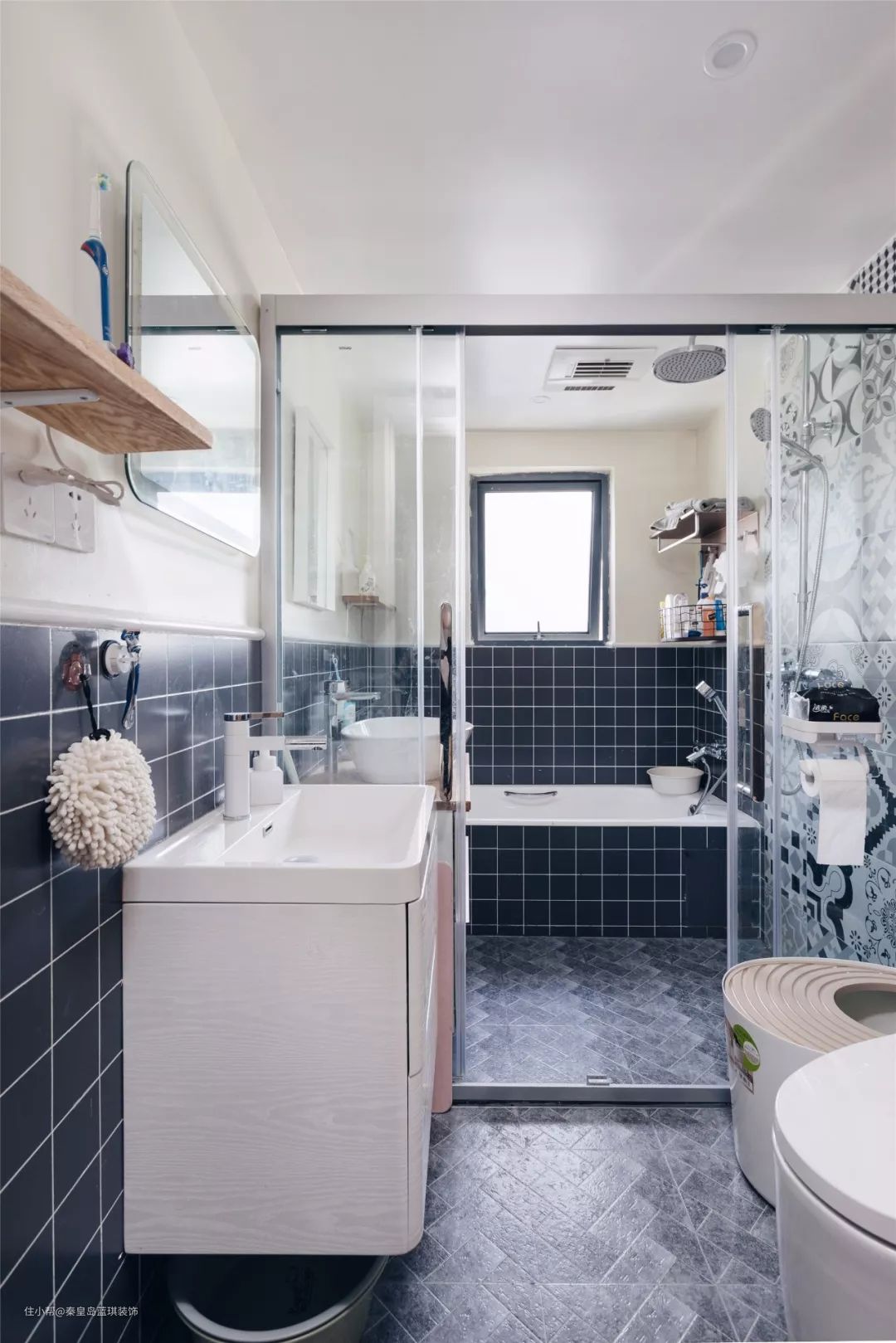 卫生间的面积比较宽敞一些,淋浴区内还做了一个浴缸,蓝色的墙地砖搭配花砖点缀,整个卫生间给人一种清新、明快的感觉。