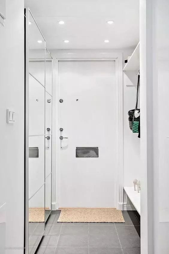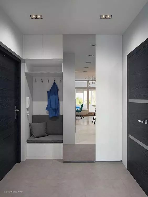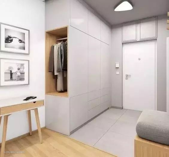 玄关的应用场景有很多,比如,进出门换衣物鞋子服取放包包,照镜子整理仪容,以及收放快递、放置雨伞等收纳功能
