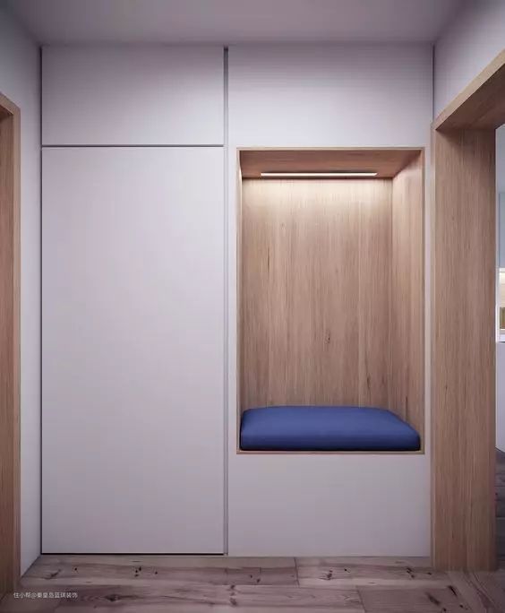 对于面积有限的小户型玄关,根本无法全部利用两面墙壁,下方沙发柜便因此而生,在壁柜留出一块单独面积,来代替沙发的功能