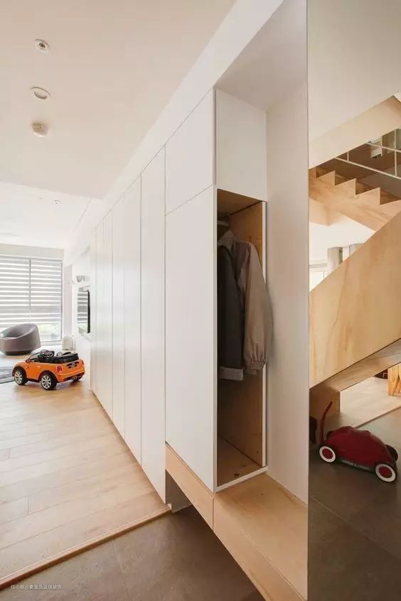大壁柜连接着天花板与地板,隐性分类需求都被分置在每一个小置物柜中,大壁柜另一边,置办一张沙发,平时换鞋就方便多了