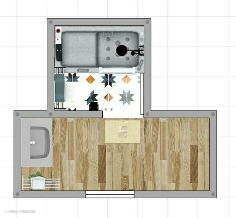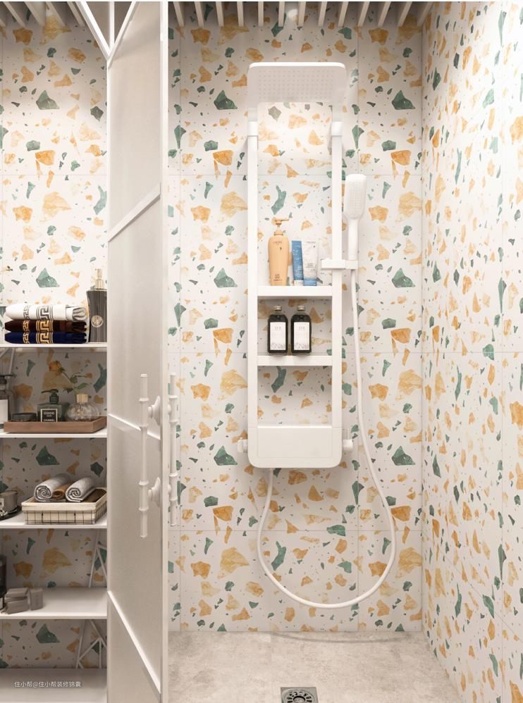 由于空间太小,所以对浴室进行了二分离,根据使用频率将洗漱区分为一侧,蹲厕和淋浴相连。如果介意蹲厕和淋浴区相连,也可以在中间安装一个浴帘,定期更换也非常方便。
