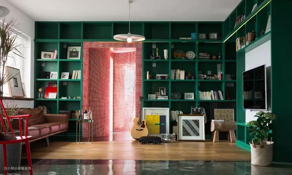 ▲ 这是几个学生合租的房子,客厅可以随时变换各种模式,对面是开放式大书房2、 养孩子模式 有孩子和没有孩子的装修,完全是不同的。很多人的第一套房子可能是婚房,不久之后就会考虑有孩子,养孩子的客厅就会考虑孩子的安全、孩子的玩耍、孩子的教育和成长等等问题。