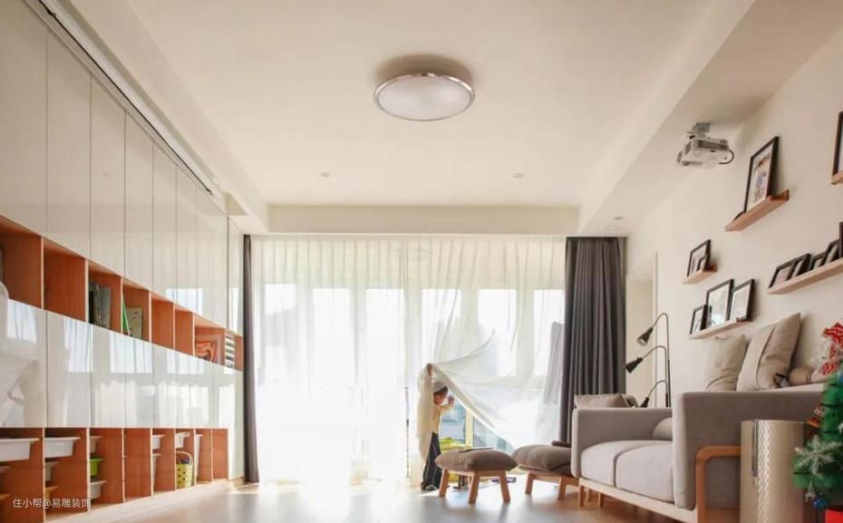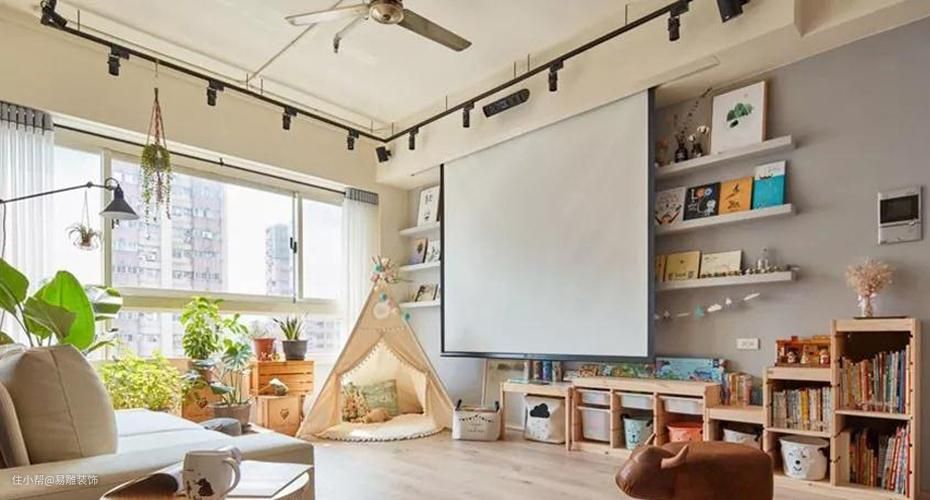 ▲ 这个台湾妈妈直接把电视背景做成了孩子的绘本架和收纳区,用升降投影替代电视,可以随时切换模式