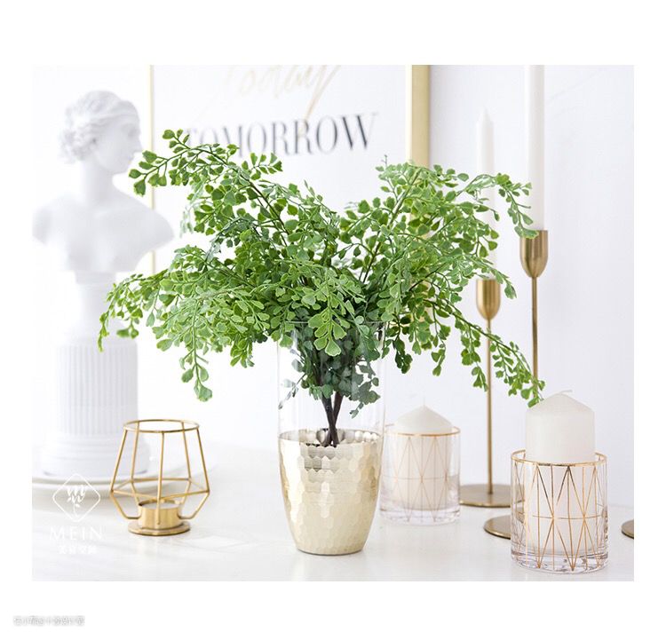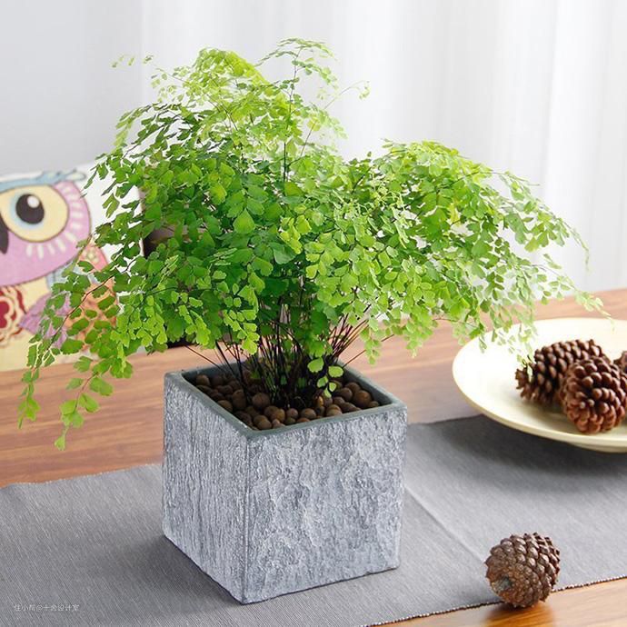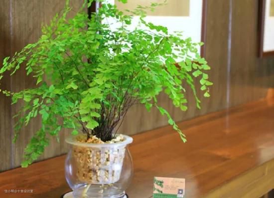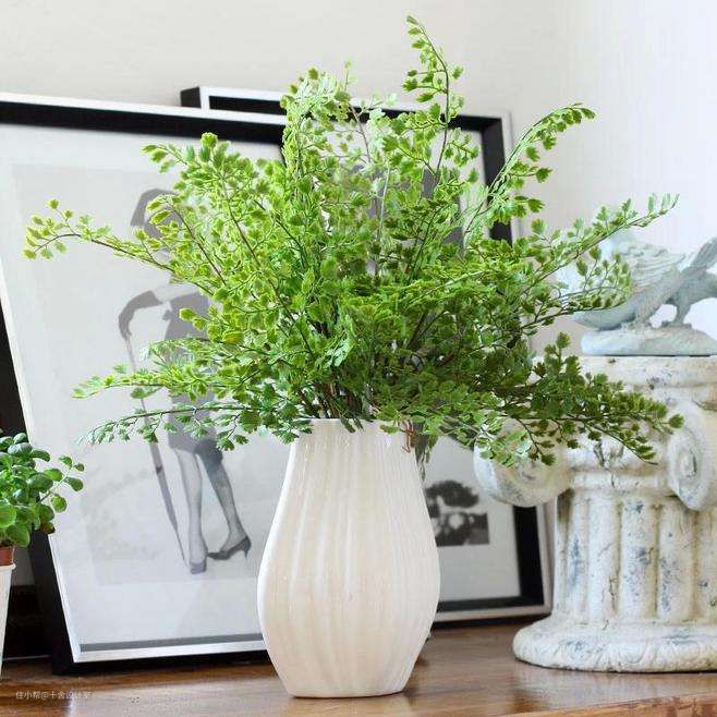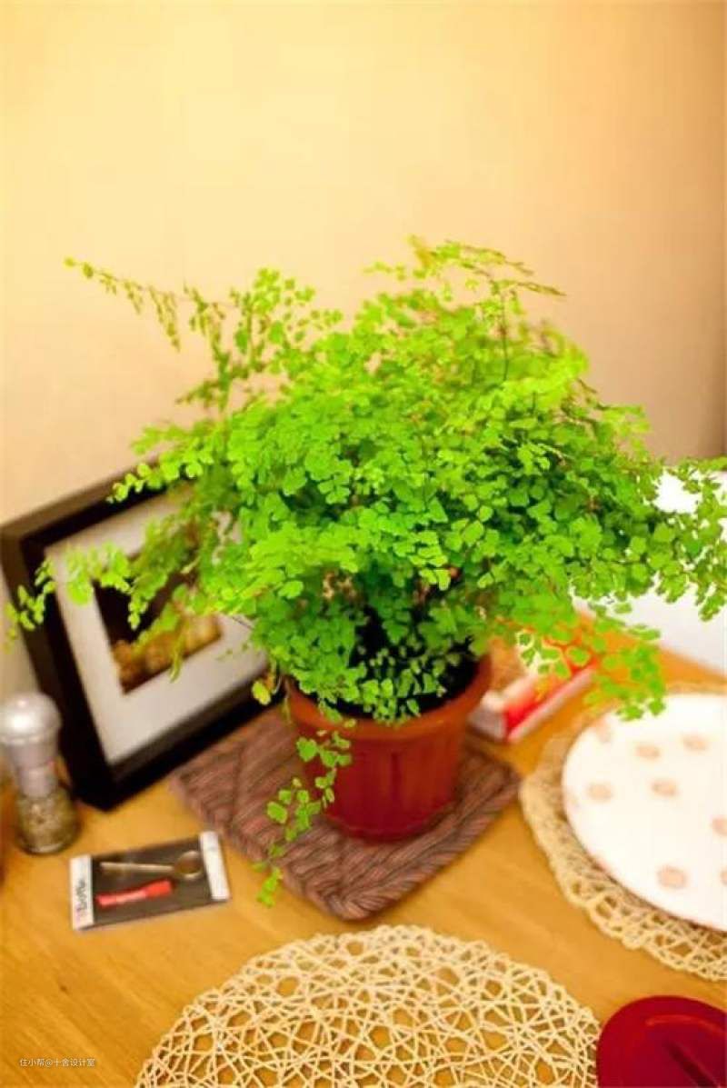 在客厅的桌面台几上摆放迷你观叶盆栽铁线蕨,能够净化空气,而且还能陶冶情操。