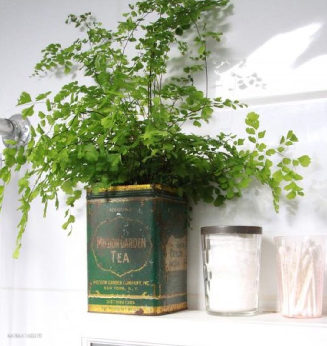 破旧铁皮盒与铁线蕨搭配,放于木质桌面上,更是复古文艺范儿十足。
