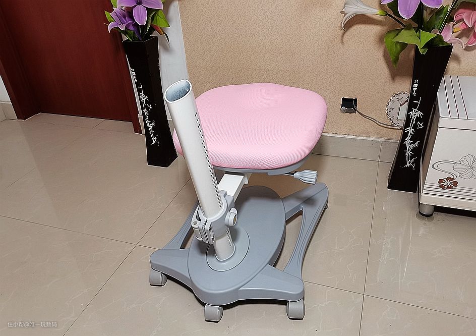 底座采用五点的支撑状,可以增大接触面积。而且底盘设计非常宽大,孩子学习的时候可以踩在宽大的底盘上,不至于无处可放。安装靠背升降架,可以根据孩子的身高进行调节,满足不同身高、不同年龄段的孩子选择。学习椅的底座与靠背升降杆的固定是使用底部四颗比较粗的螺丝来进行固定,一定程度上保证了安全性。
