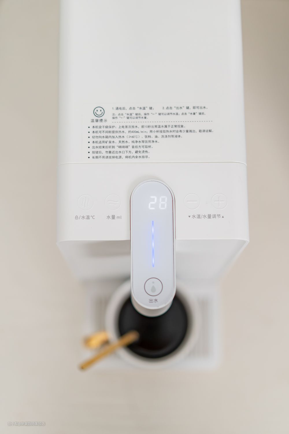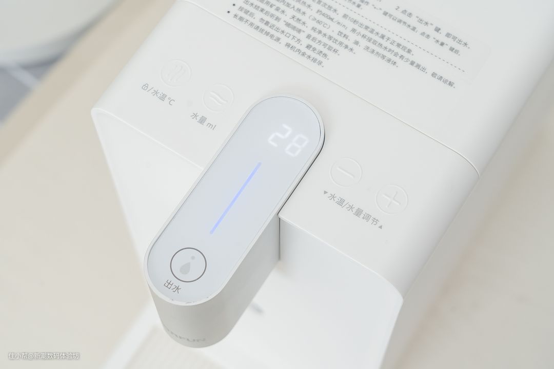 按键全部设计在机身顶部,左边是水温和水量功能按键(自带童锁功能),而右边则是调节按钮,可以实现40-100℃共计8档水温的调节。