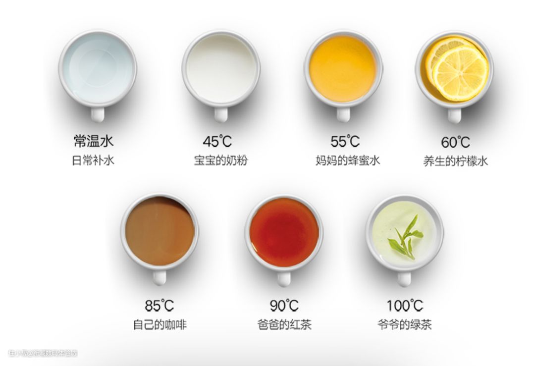 引用一张官方的图片,八档水温基本上涵括了我们日常生活中常用到的饮水、冲调场景,需要注意的是由于它并不具备过滤、净化功能,所以我都是往水箱里装入桶装水或纯净水,用自来水的话也不是不可以,但就只能选择100度了,不然喝了可能会拉肚子,因为没有完全烧开。