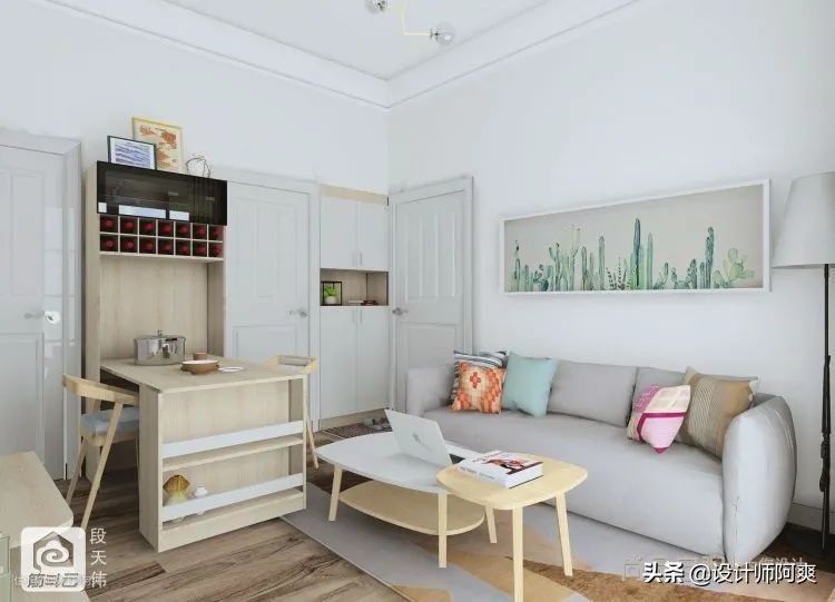也不全是公寓才有,鱼仔一个上海朋友,刚买了套50多平的小两居,客厅区域的面积仅有8~9㎡。就是下图这个样子:
