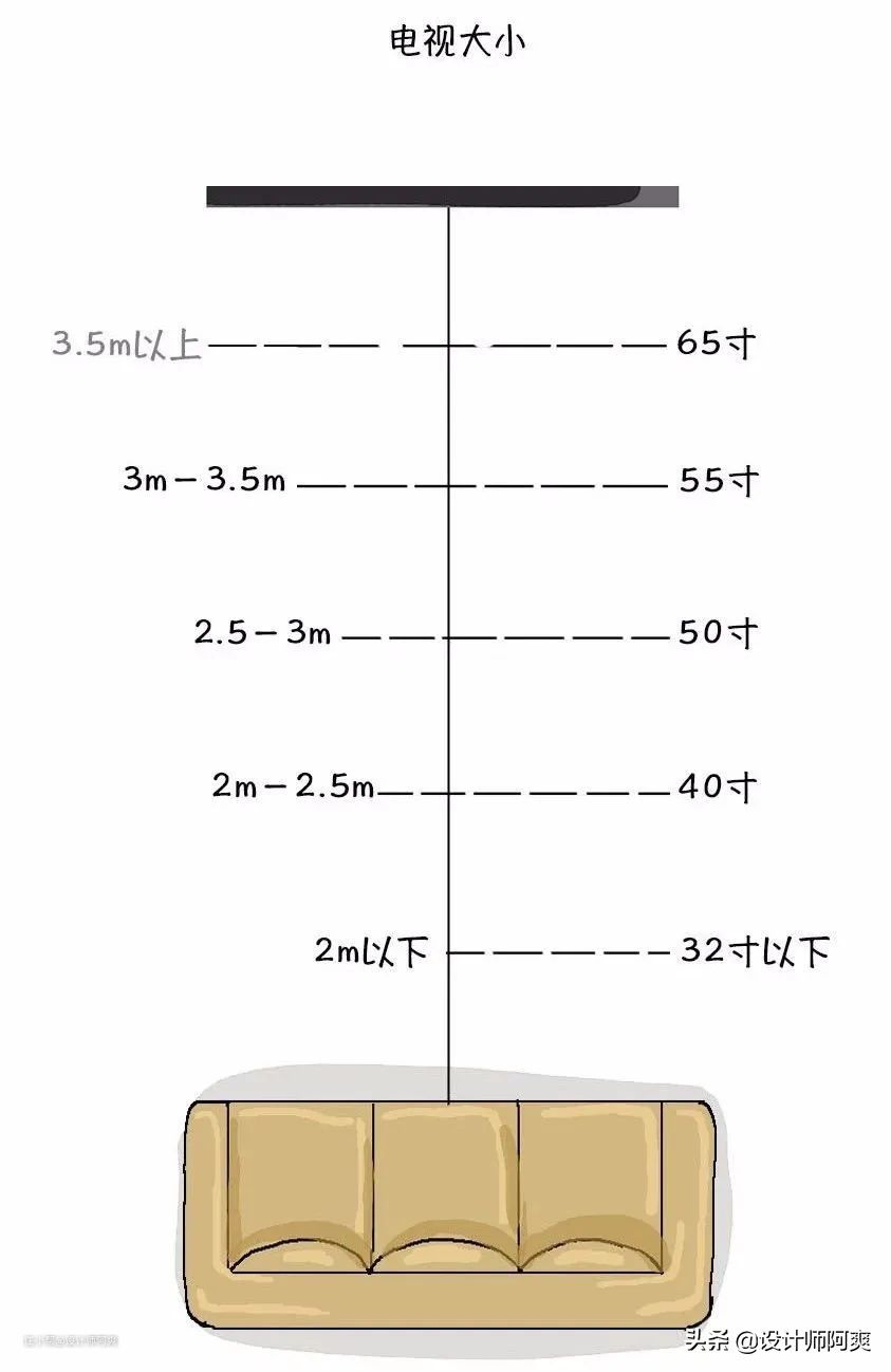 电视尺寸控制在42寸以内,因为一个10㎡都不到的客厅,从沙发到电视的距离顶多2-3m,有些仅有1m。