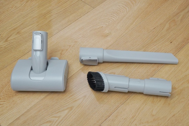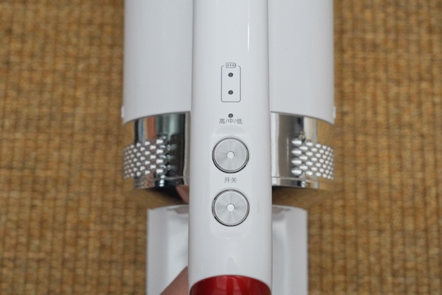 人性化设计方面,在吸尘器的电池和尘杯之间还特地做了一个凹槽,方便清扫过程中临时靠墙或者桌面上。