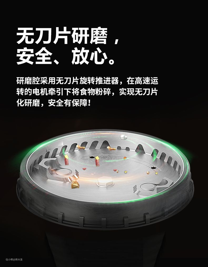 并且在研磨腔外部设计了磁力环,防止勺子刀叉之类的掉入机器造成损失,可以直接吸附在入口处。