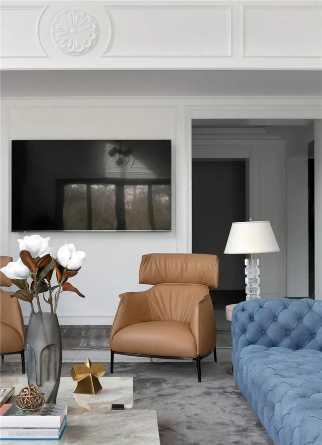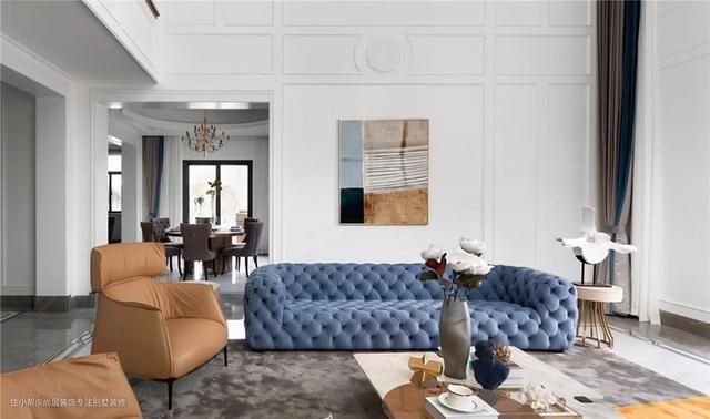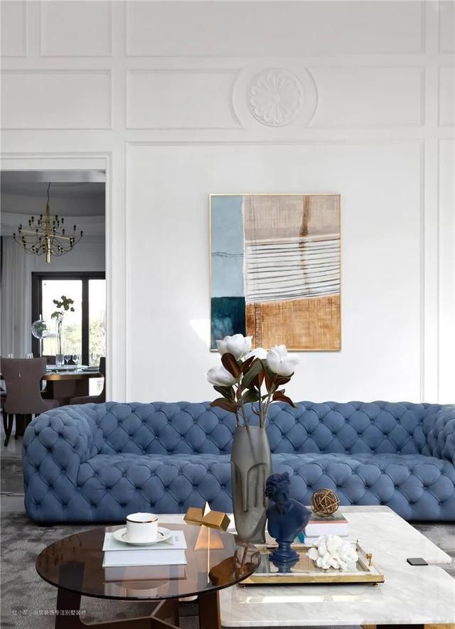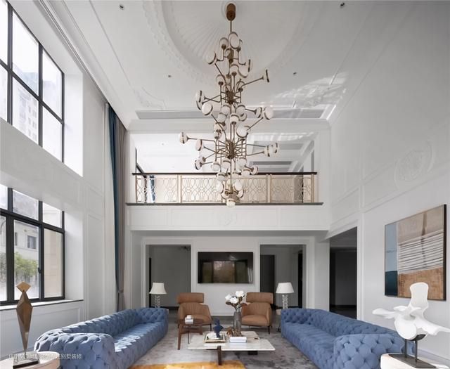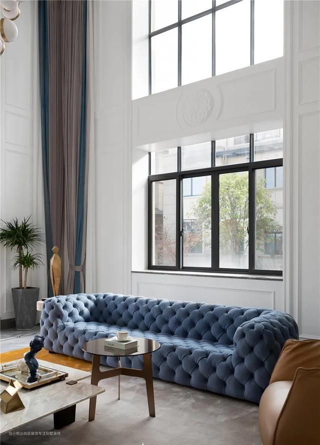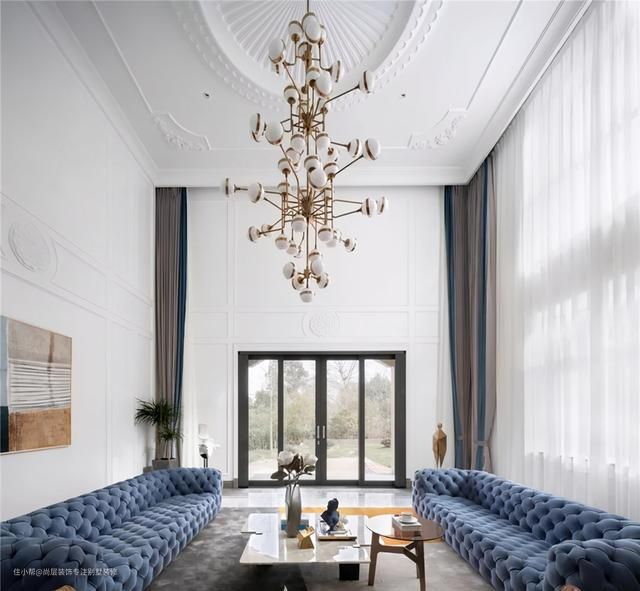 沿着墙面向上,交汇于顶端,现代质感的长吊灯,又将人的视线实现上下贯通感。对称的蓝色沙发,诉说着法式的浪漫和优雅。