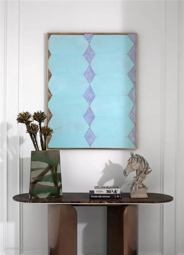 蓝色的几何挂画,作为后续客厅蓝色沙发的开篇,结合绿植以及马头雕塑,奠定艺术格调。