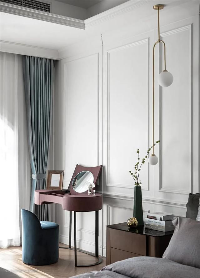 融入曲线元素的梳妆台,垂吊下来的金属壁灯,于细节处彰显生活的精致和时尚。