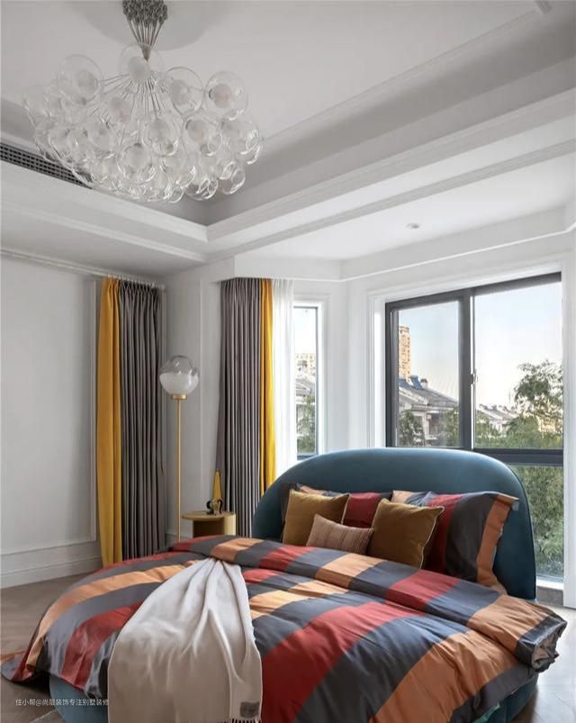 低饱和度的主卧家具,让空间中物与物、人与物距离适当,曲线与直线的互相搭配,丰富了空间内涵的同时,也凸显了舒适的氛围。