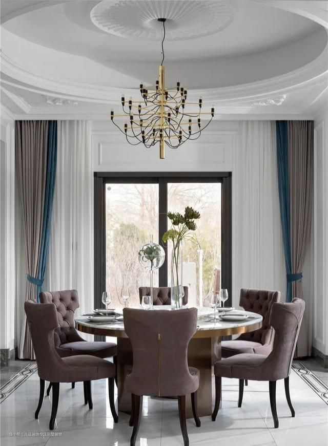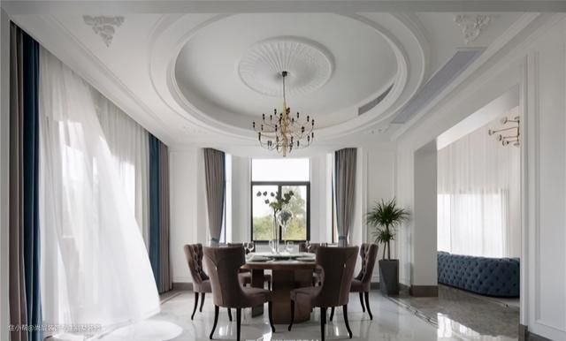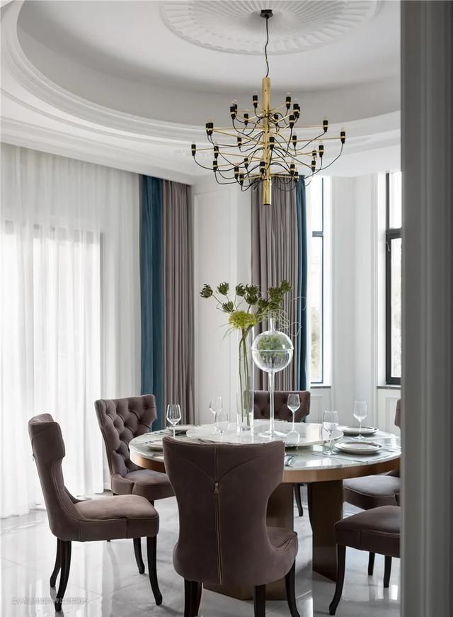 餐桌选用深色色调,给人庄重沉稳的视觉感受,表现主人对招待客人的重视。吊顶的圆形石膏线,形成空间的和谐统一。