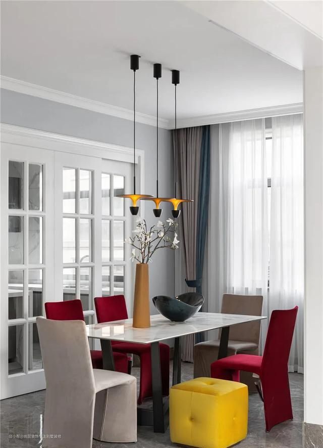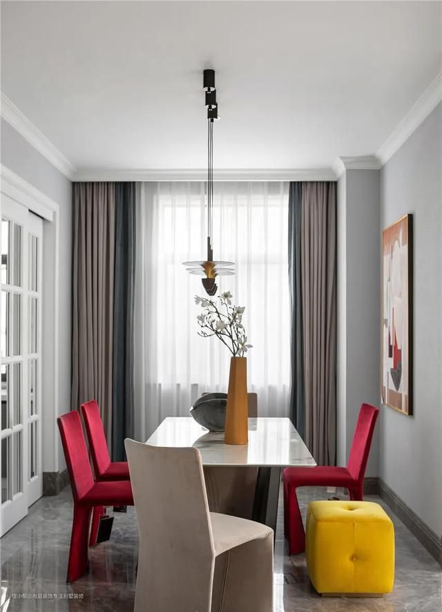 西厨空间是家人之间进餐的地方,色彩分明的座椅,搭配长条大理石餐桌,表现生活的自在与随性。每次走在这里,心情也跟着明媚起来。